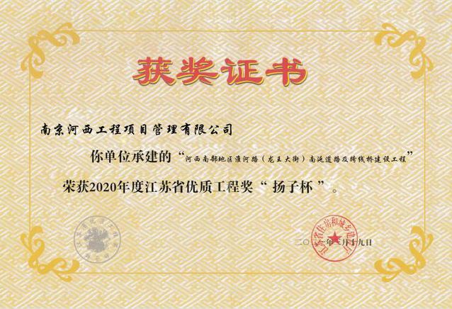 河西南部地區(qū)淮河路(龍王大街)南延道路及跨線橋建設工程喜獲省優(yōu)質(zhì)工程獎“揚子杯”
