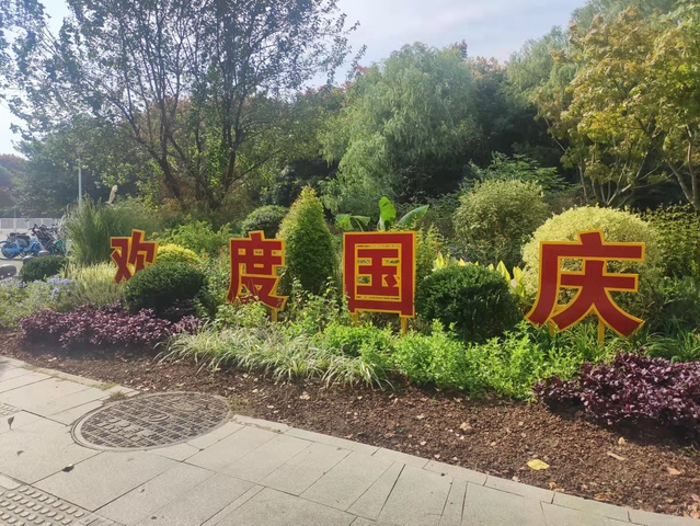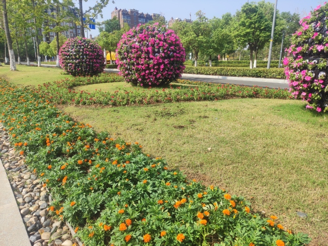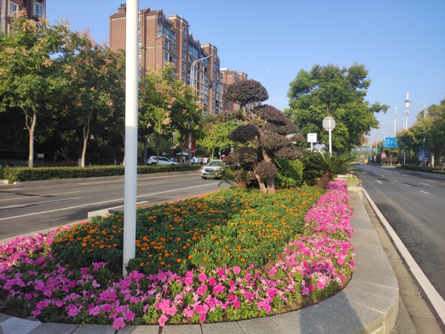 水韻路中分帶的花球也換上了新裝,10個巨大的牽?;ㄇ虮患t黃色的花帶簇擁著,在太陽下盡情地綻放著,像是小孩的笑臉,歡快地為祖國母親慶生。