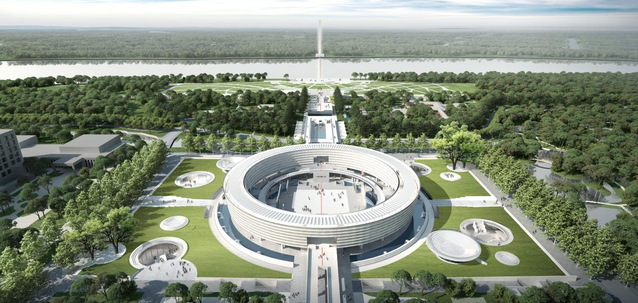 項(xiàng)目建設(shè)范圍總面積約為62000 平方米。建設(shè)內(nèi)容包含憲法展廳及宣誓廣場(chǎng)、法之谷城市綠坡及配套設(shè)施、場(chǎng)地東西兩側(cè)的人行天橋、場(chǎng)地東側(cè)的公園主入口廣場(chǎng)等(場(chǎng)地北側(cè)的濕地公園維持現(xiàn)狀,不做開發(fā))。容積率 0.09,建筑密度 9%,綠地率 36.8%。本項(xiàng)目總建筑面積為 29896 平方米,其中地上建筑面積 5584 平方米,地下建筑面積24312 平方米,建筑高度 16.5米,地上 2 層(首層架空),地下 1 層。功能包含展覽及地下車庫(kù)等。