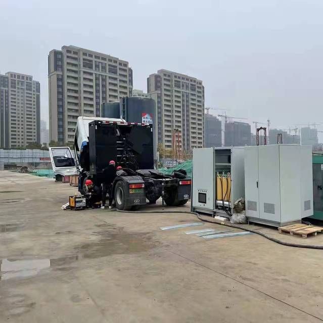 受接入的施工用電線路功率限制,現有配電箱無法滿足新增打樁設備用電需求。按常規(guī)做法需增設柴油發(fā)電機,但此類型發(fā)電機噪音大,排放高溫廢氣,不符合現代社會節(jié)能環(huán)保的大趨勢。因此,本項目率先引進無噪音、無廢氣排放的鋰電移動儲能動力站與施工用電線路并網,在施工用電低谷期間進行電池充電,樁基施工用電高峰期間補充電力缺口。如接入的施工用電線路長期滿載,可由儲能動力站廠家運送滿電電池進行現場換電,將缺電電池運回充電。