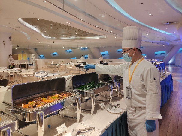 酒店為迎接大會接待任務,早部署早安排,第一時間籌建大會專項服務組與服務大使團隊,與大會各工作組細致對接,針對會議期間的防疫要求、接待動線、住宿安排、會議用餐等方面研究制定出“會議閉環(huán)”專項方案,將會議中心、酒店大堂及客房樓層劃入閉環(huán)管理。